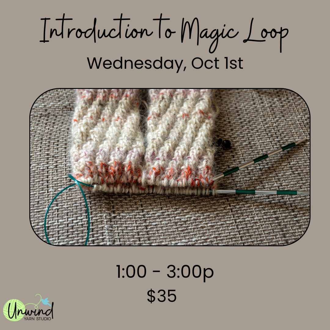 Learn to knit in the round using the “magic loop” technique, a handy alternative to double pointed needles! Catch this skills class just in time for our October Stitchalong.