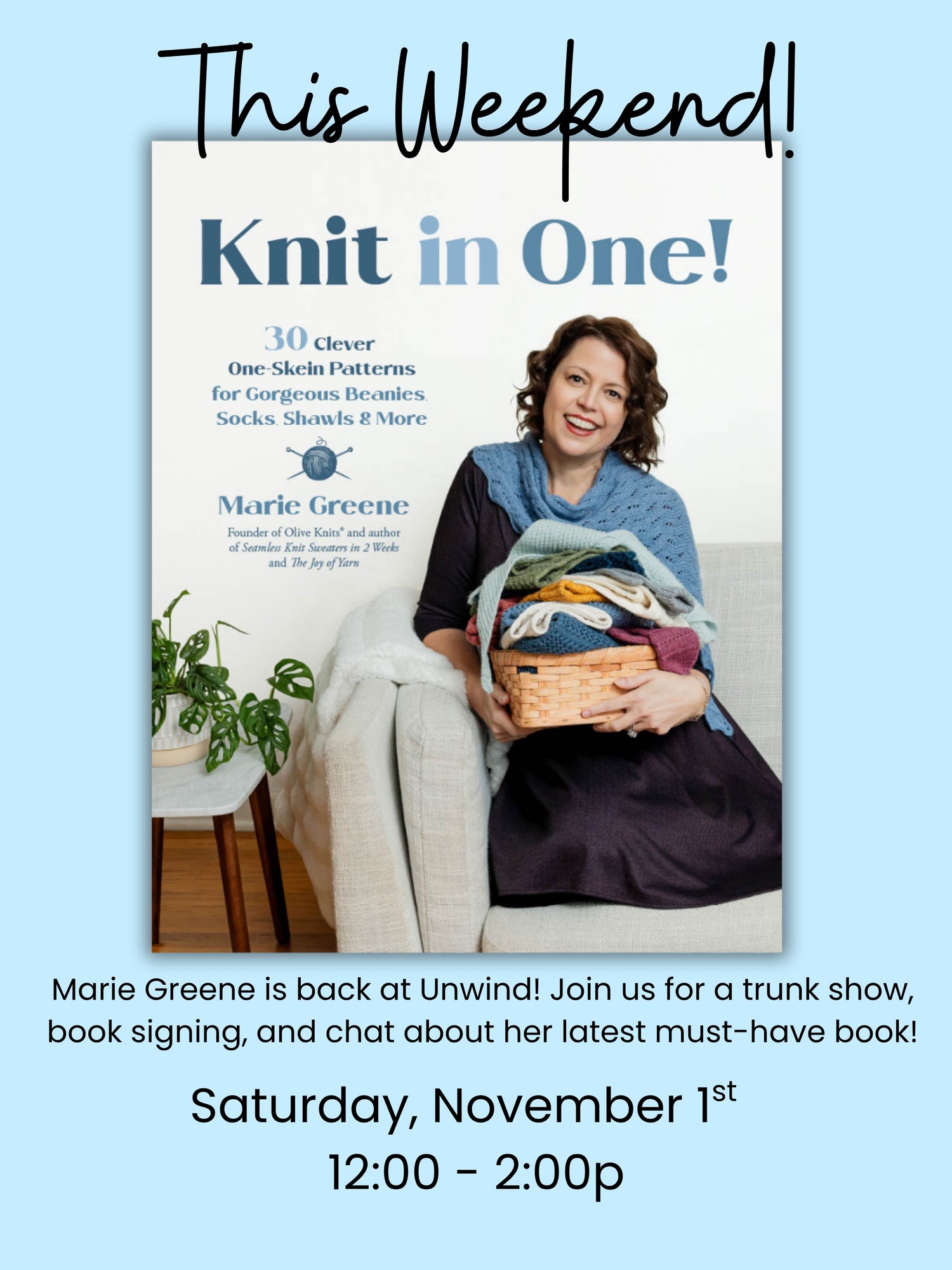 Marie will bring a trunk show, talk with us, and sign her books, including her latest and greatest: Knit in One! Come get your signed copy full of patterns for that single, perfect, must-have skein.
