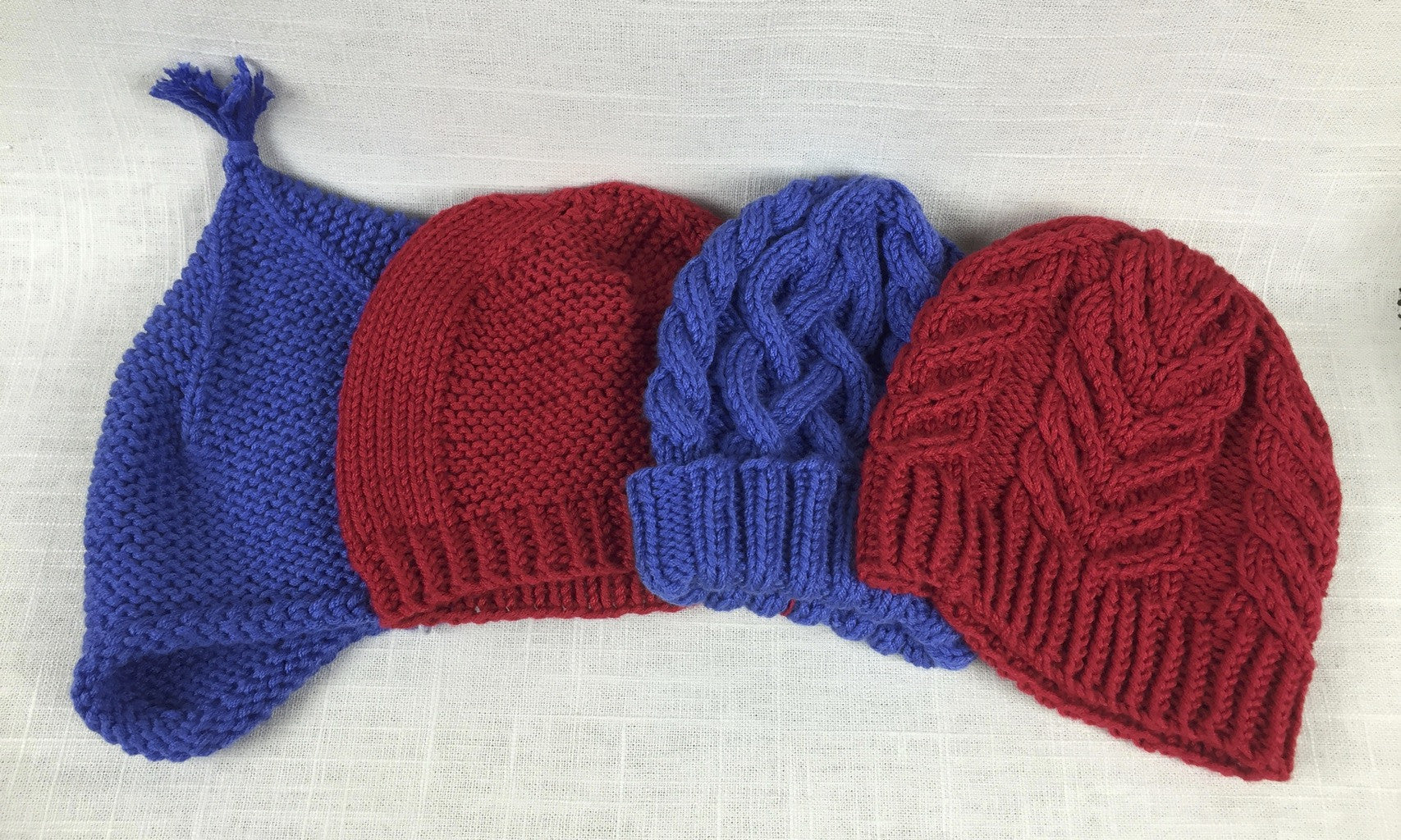 Hats from left to right are: Ear flap Hat, Barley, Travelling Cables, Antler